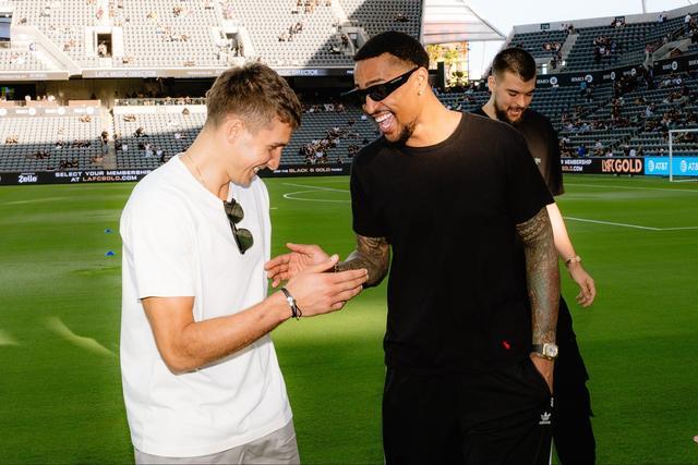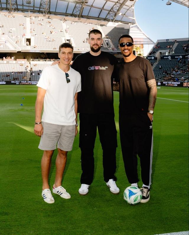 本場比賽,來自NBA的同城球隊(duì)洛杉磯快船的祖巴茨、博格丹和約翰-科林斯三人來到現(xiàn)場觀看比賽,賽前,來自克羅地亞的祖巴茨還展示了一下自己的腳法,賽后,三人代表快船隊(duì)向?qū)O興慜贈送專屬球衣。