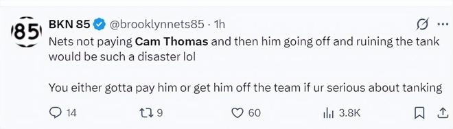 托馬斯首節(jié)6中6,三分1中1,罰球1中1拿到14分1籃板1助攻1搶斷,NBA官方都發(fā)推為他打Call,首節(jié)他幫助籃網(wǎng)打出39-29的高潮。