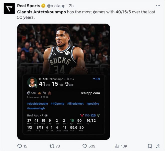 2.雄鹿隊史56次40+超過賈巴爾成為隊史第一人;