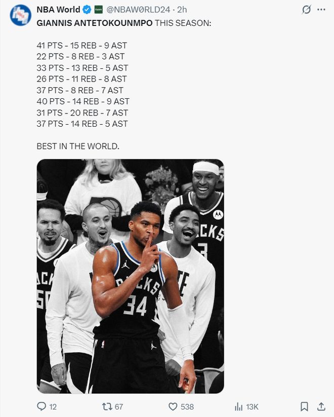 美媒NBA World曬出揚(yáng)尼斯這八場比賽的數(shù)據(jù)后寫道:全世界最強(qiáng)選手。