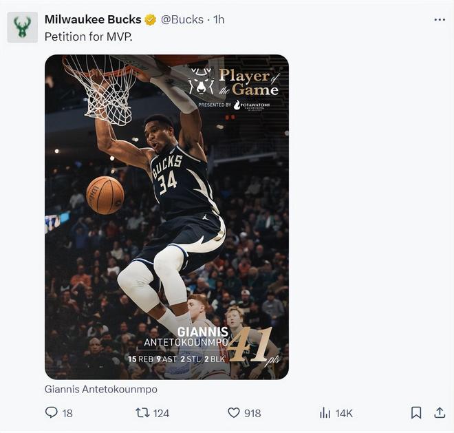 全場比賽揚(yáng)尼斯37分鐘,32中16,三分3中1,罰球11中8,拿到41分15籃板9助攻2搶斷2蓋帽,命中率50%,攻防一體,雄鹿官方:申請MVP吧。